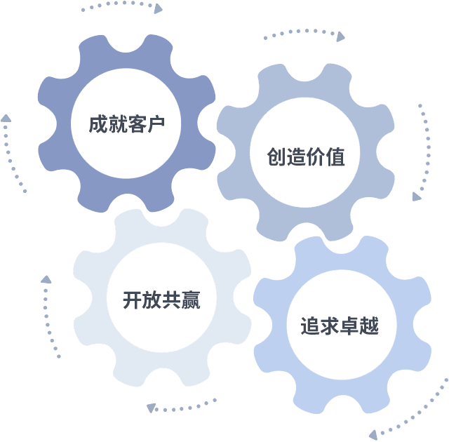 成就客户是一切决策的出发点,,创造价值是衡量所有工作的标准,,,,追求卓越是我们做事做人的态度,,,开放共赢是我们的格局也是最终的结果。。。。价值观的齿轮环环相扣,,,,推动着组织里的每个人不断向前。。。。
